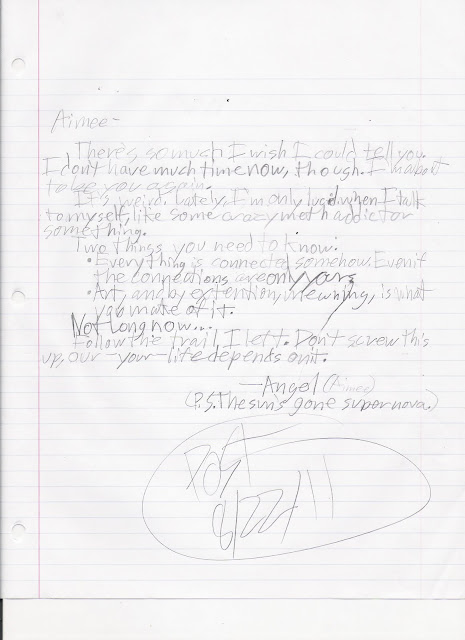The strangest part, though...I'm supposed to publish everything. There are specific dates, sometimes even times, written on everything. And I found a note, in my own handwriting, that pretty much says my survival depends on me posting this shit when I'm supposed to. I guess I was making "deals with the devil." Yippee.